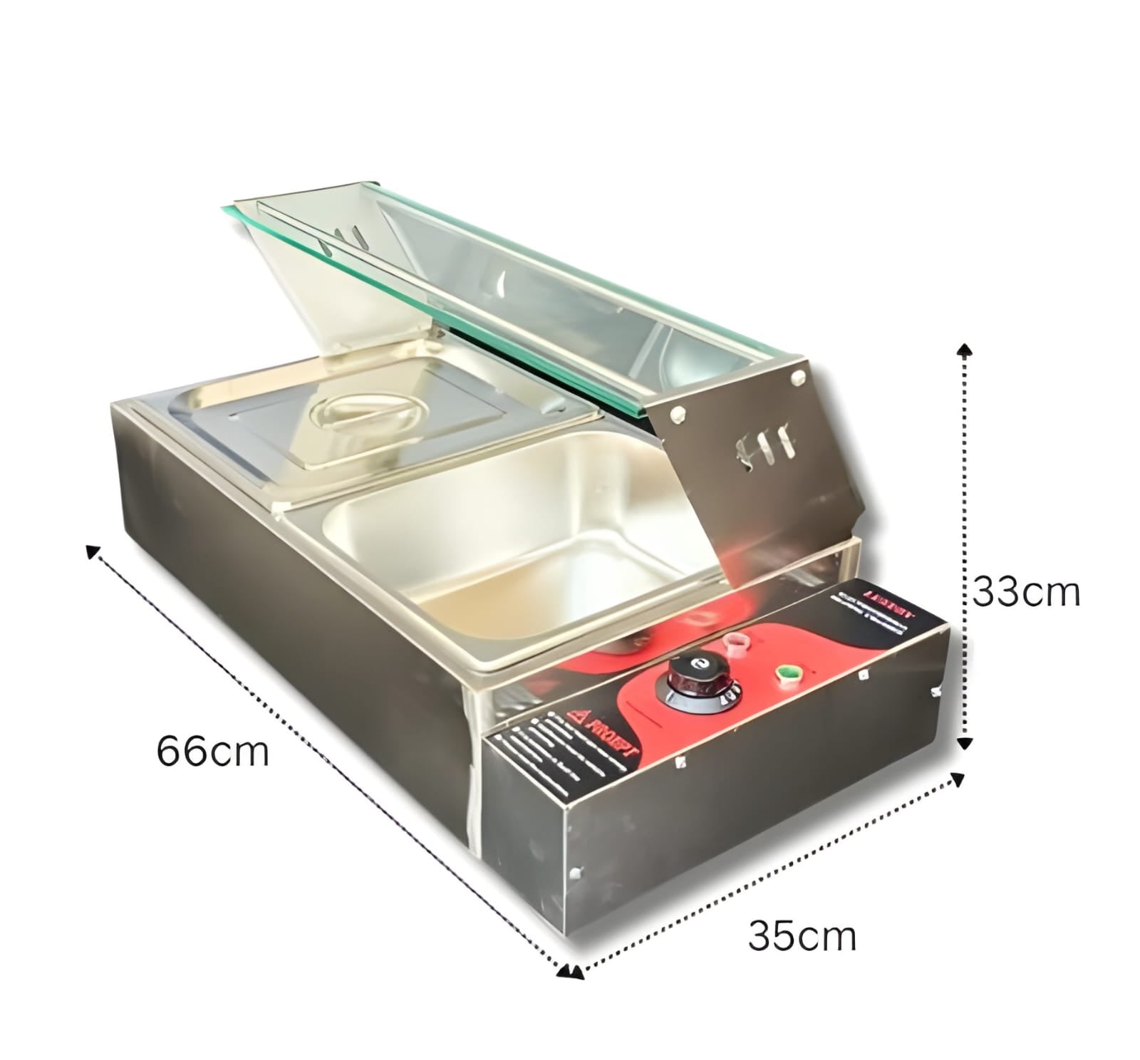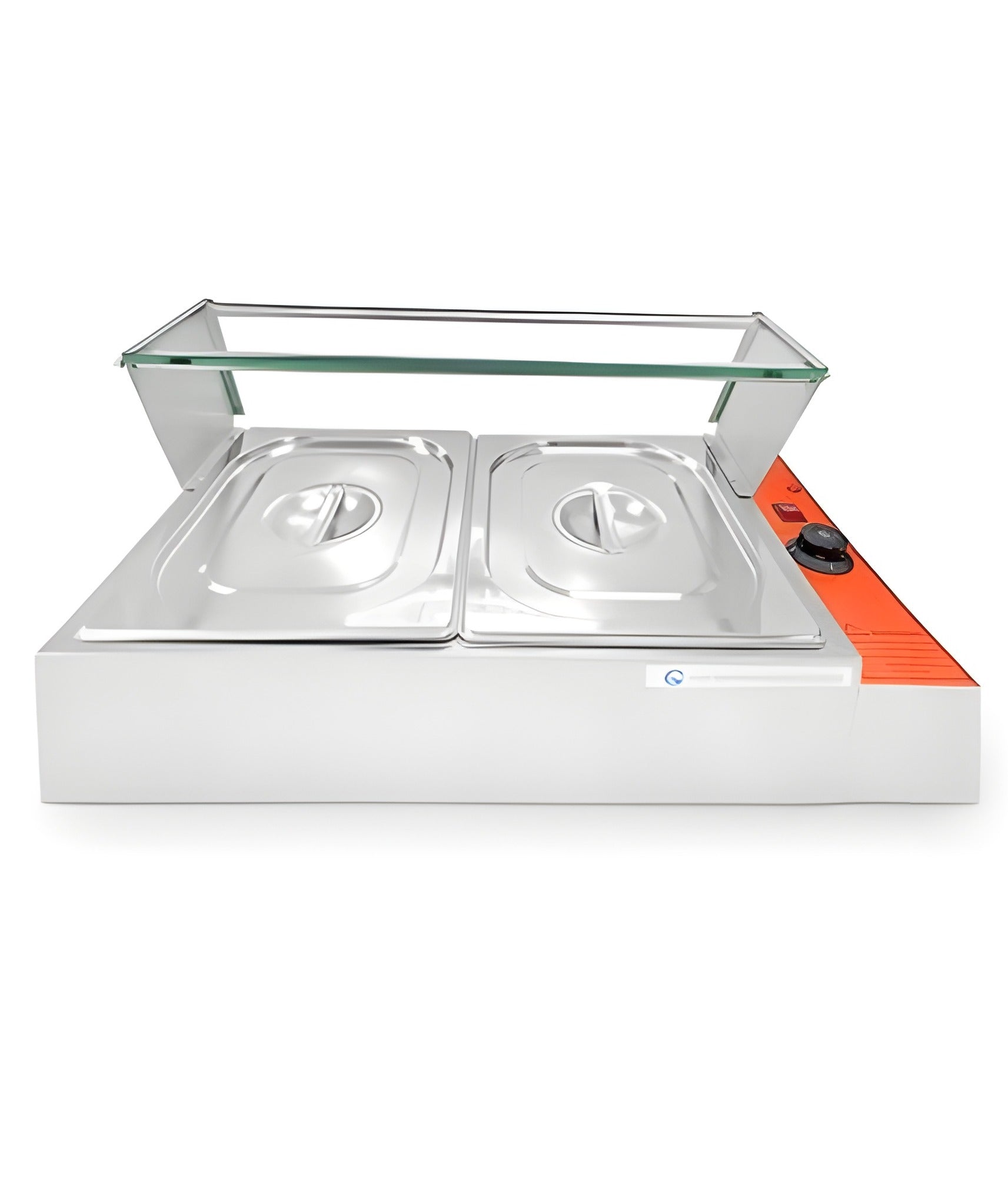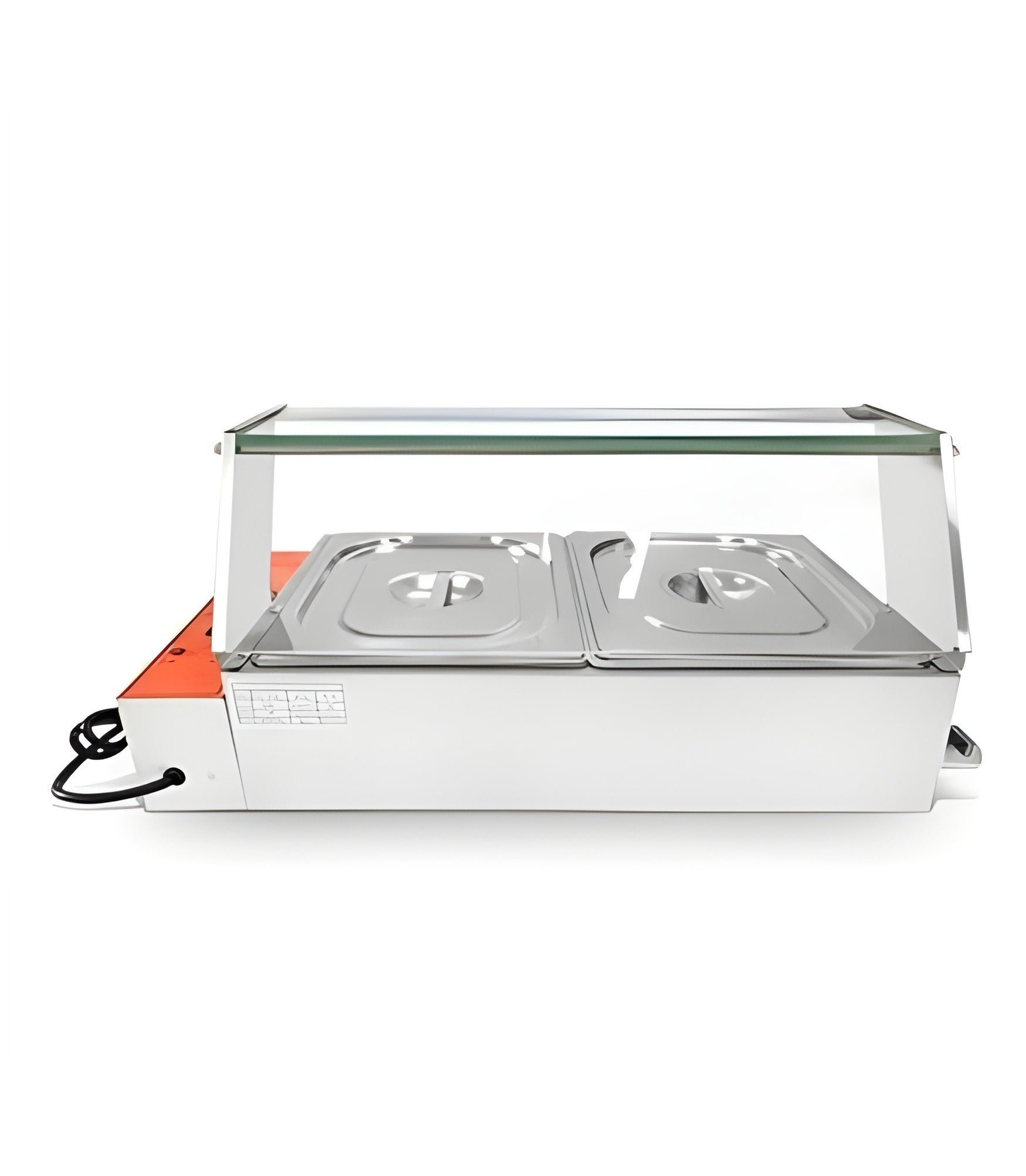 Our Electric Bain Marie with 2 compartments is a compact and efficient food warming solution for professional kitchens and catering services. With two 1/2 GN pans of 100mm depth, each holding up to 5.5 liters, it offers ample capacity while maintaining a small footprint. The unit operates on 220V~50Hz power supply and consumes 2000W for rapid and even heating. A front-mounted control dial ensures easy temperature regulation. High-grade stainless steel construction ensures durability and hygiene in demanding environments. The protective glass cover adds an extra layer of safety and keeps food visible for service. Ideal for keeping soups, gravies, and side dishes warm during service hours.