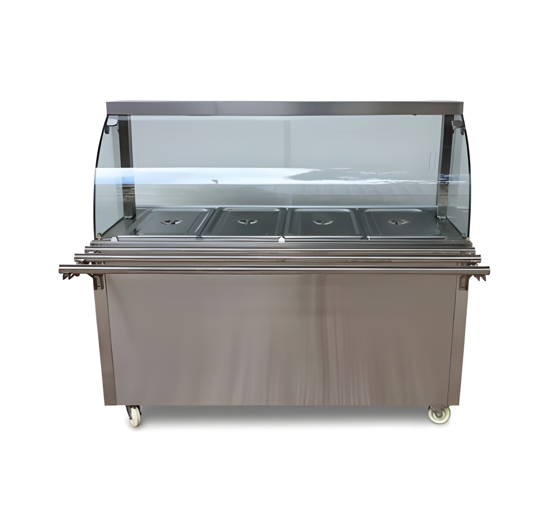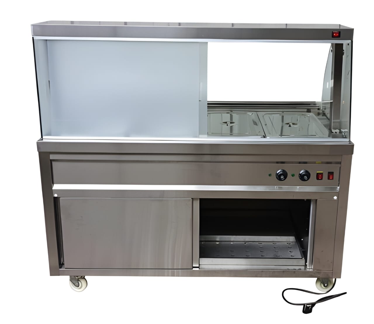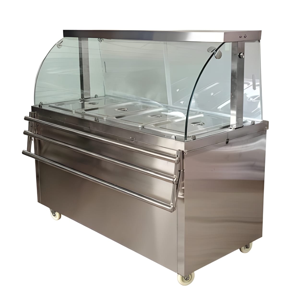 Our Premium 4000W Electric Hot Bain Marie Ready Counter with four compartments offers extended food holding capacity for busy kitchens. It delivers consistent heat to keep dishes at perfect serving temperature. The design includes a sturdy stainless-steel frame for long-term durability and hygiene. An LED lighting setup highlights displayed food beautifully. The unit is fitted with acrylic sliding doors to retain warmth while maintaining accessibility. It comes with four wheels for easy movement, with two locking ones for safety. The hot inner cabinet supports uniform heating across all compartments.